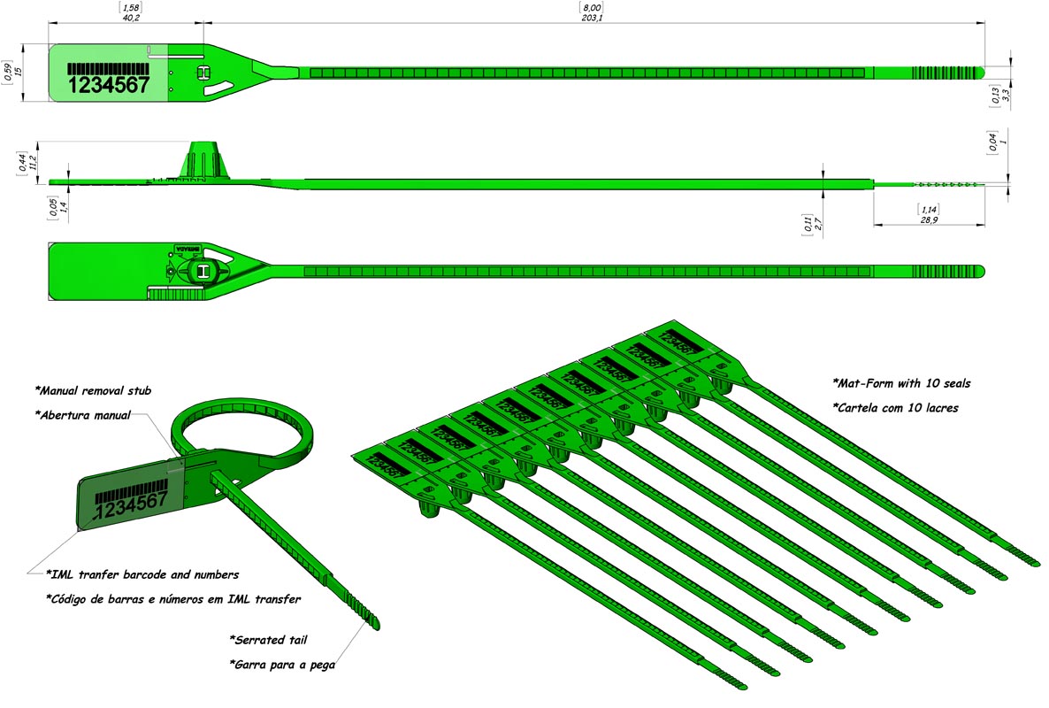 One-piece Adjustable Length Toll-less Riplock Seals 8.5", manufactured in Polyethylene, with Barcode Serial Numbers (250 seals per Bag), used Warehousing and Transportation, Airline, Banking and Pharmaceutical applications.
